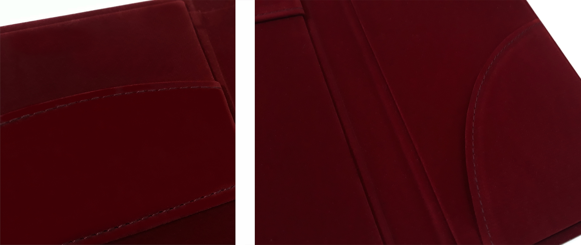 - Inside there is a velvet corner pocket for the bill and a velvet card slot.